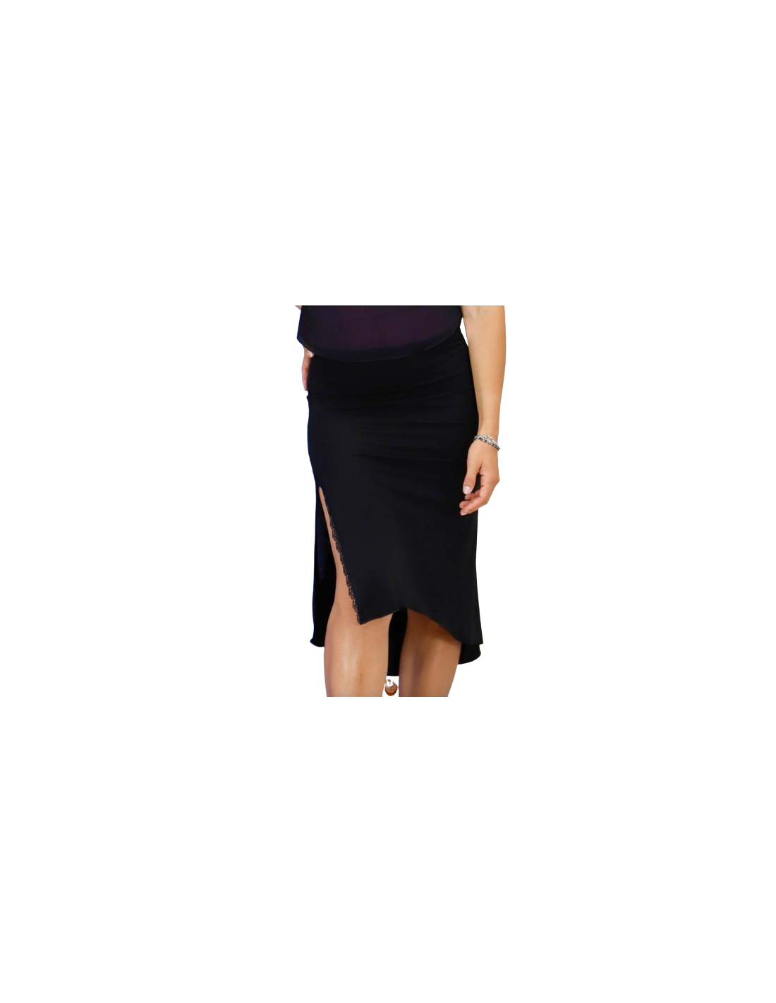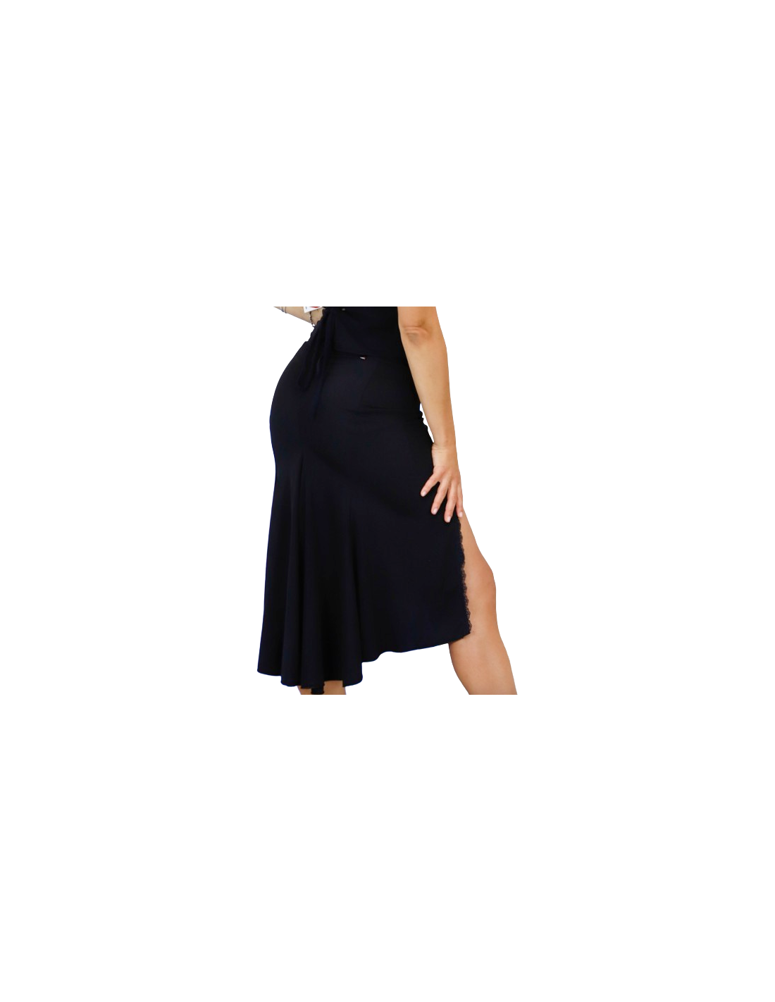 Der handgefertigte Tangorock Samba Opt. 24 von Rossa Spina aus Rimini besticht durch seine fliessende Silhouette und feminine Details. Der ausgestellte Schnitt mit Beinschlitz vorne lädt zu elegantem Schwung bei jeder Drehung beim Tangotanzen ein.