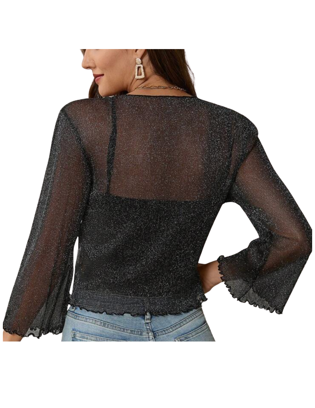 Eleganter Bolero aus schwarzem Glitter-Mesh mit 3/4 Glockenärmeln und Wellenabschluss – perfekt über einem Tanzkleid und ideal kombinierbar mit Ihren Dance Shoes Zurich für stilvolle Auftritte an kühleren Abenden.
