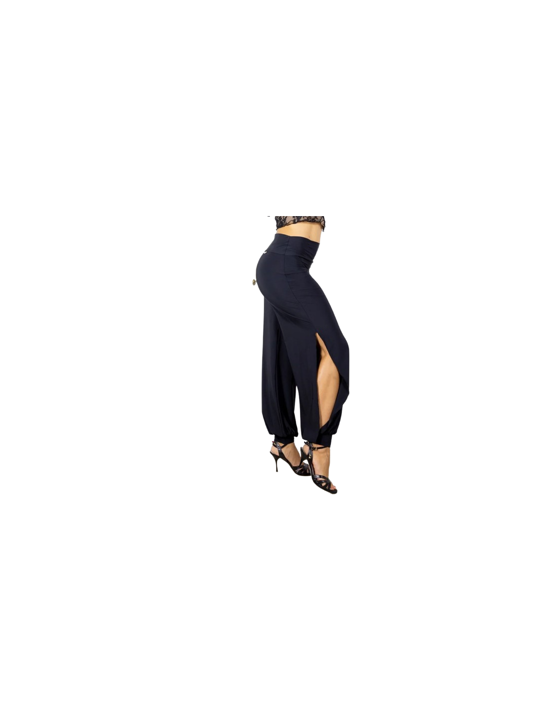 Die handgefertigte Tangotanzhose Laila 2 Opt. 2 von Rossa Spina aus Rimini besticht durch ihre fliessende Silhouette und feminine Details. Die halboffenen Beinpartien läden zu elegantem Schwung bei jeder Drehung beim Tangotanzen ein.