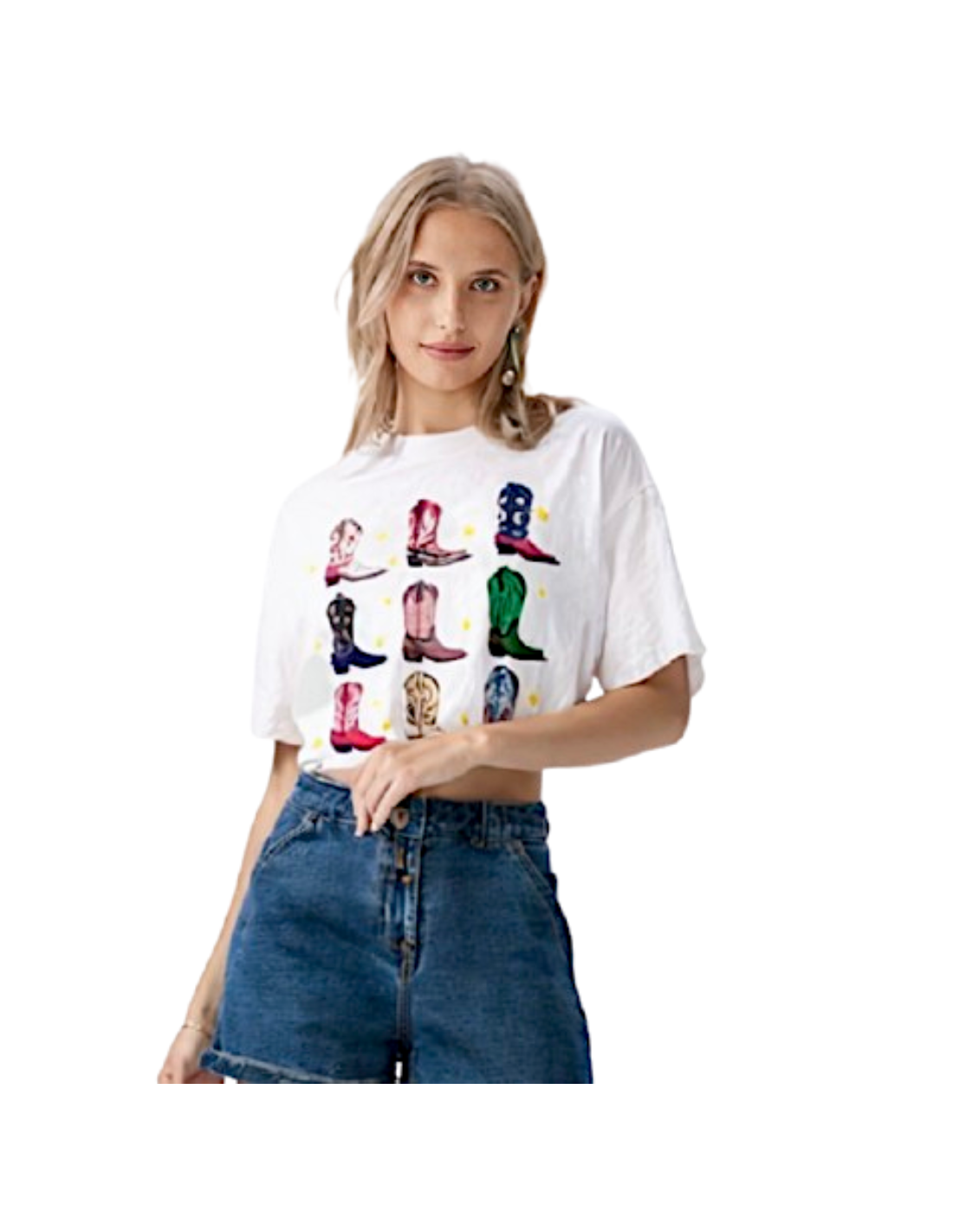 T-shirt pour la danse country / linedance en blanc avec imprimé bottes de cowboy coloré – confortable et facile à assortir. Veryfine Suisse apporte style et confort sur la piste de danse. Idéal pour une soirée de linedance.