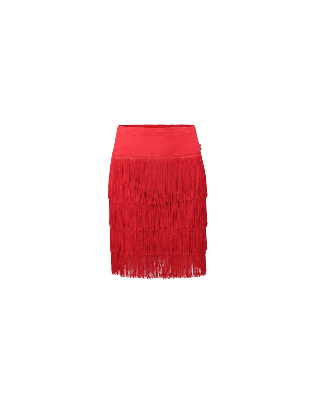Questa giocosa gonna da ballo con frange in rosso lucido lucido è un vero e proprio richiamo visivo per ogni ballerina. Il design stravagante ma elegante la rende versatile e abbinabile a qualsiasi outfit, sia per la salsa, la bachata o il ballo standard. Il taglio femminile crea una silhouette emozionante. Le frange ondeggiano fluidamente e assicurano che ogni movimento sulla pista da ballo sia valorizzato.